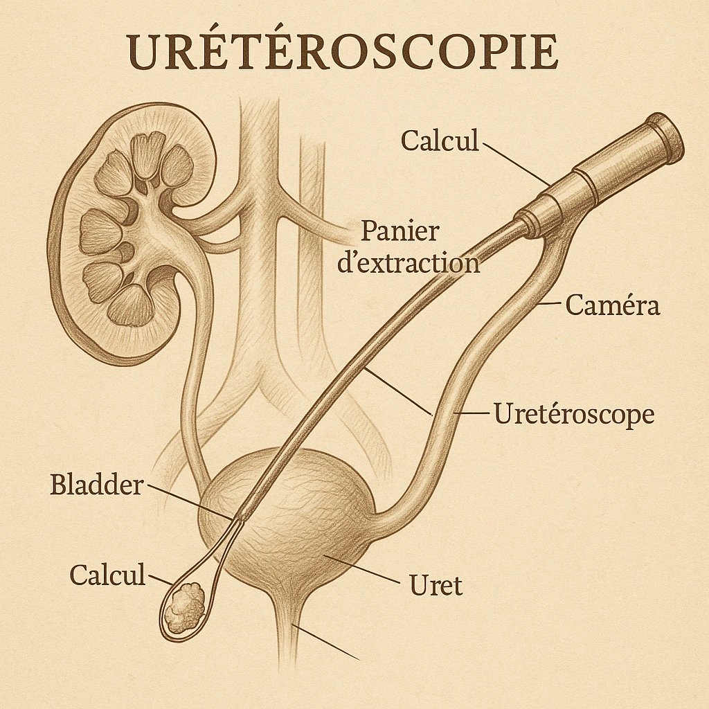 📌 L’objectif principal est l’exploration directe du système excréteur, la visualisation du calcul puis sa fragmentation (le plus souvent au laser) ou son extraction (pince, panier) via ces voies naturelles, sans ouvrir la peau.